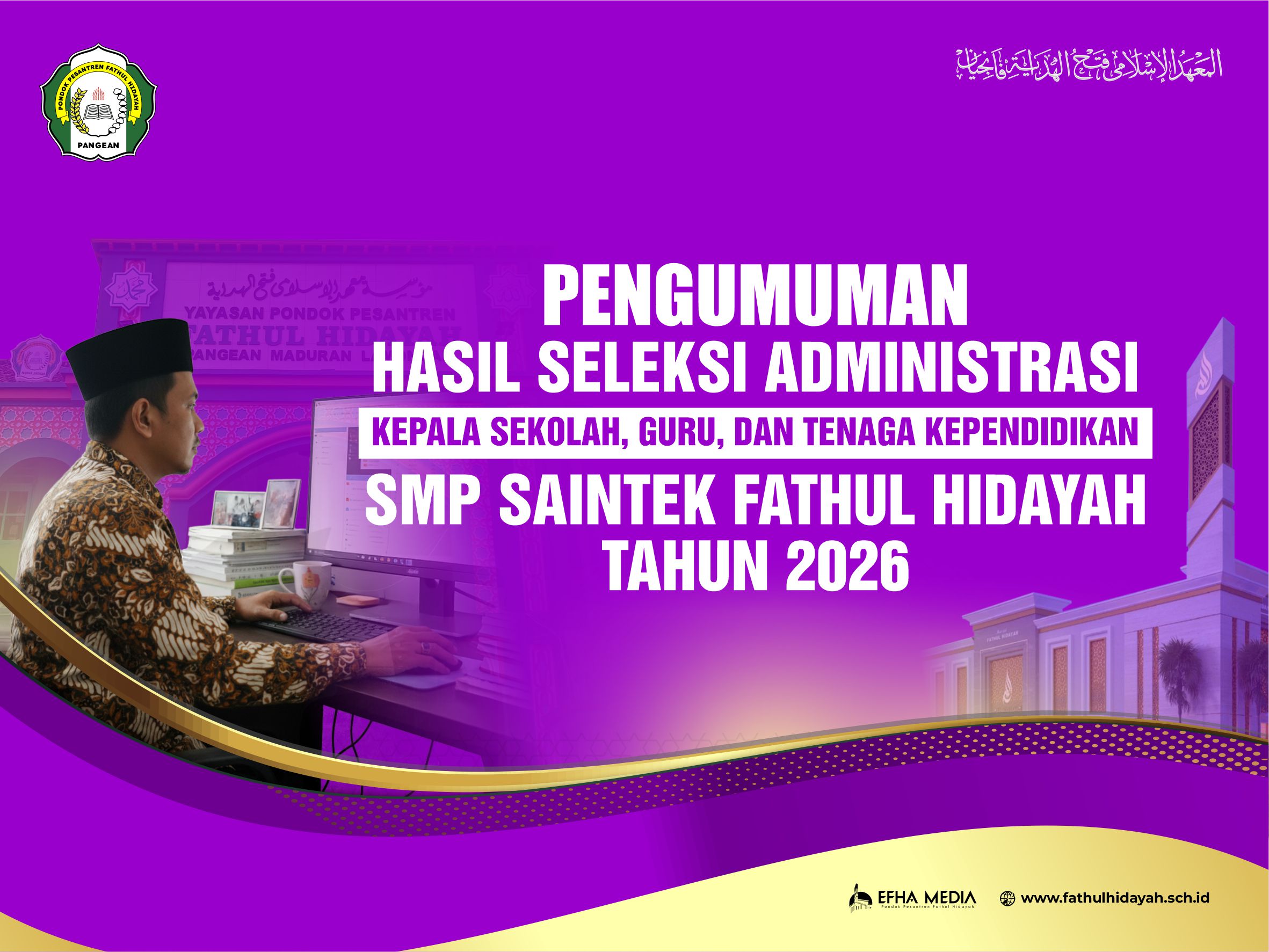 Sehubungan dengan telah dilaksanakannya tahapan Seleksi Administrasi Penerimaan Kepala Sekolah, Guru, dan Tenaga Kependidikan SMP Saintek Fathul Hidayah Tahun 2026, Yayasan Pondok Pesantren Fathul Hidayah menyampaikan hasil seleksi administrasi berdasarkan ketentuan dan persyaratan yang telah ditetapkan dalam pengumuman sebelumnya.