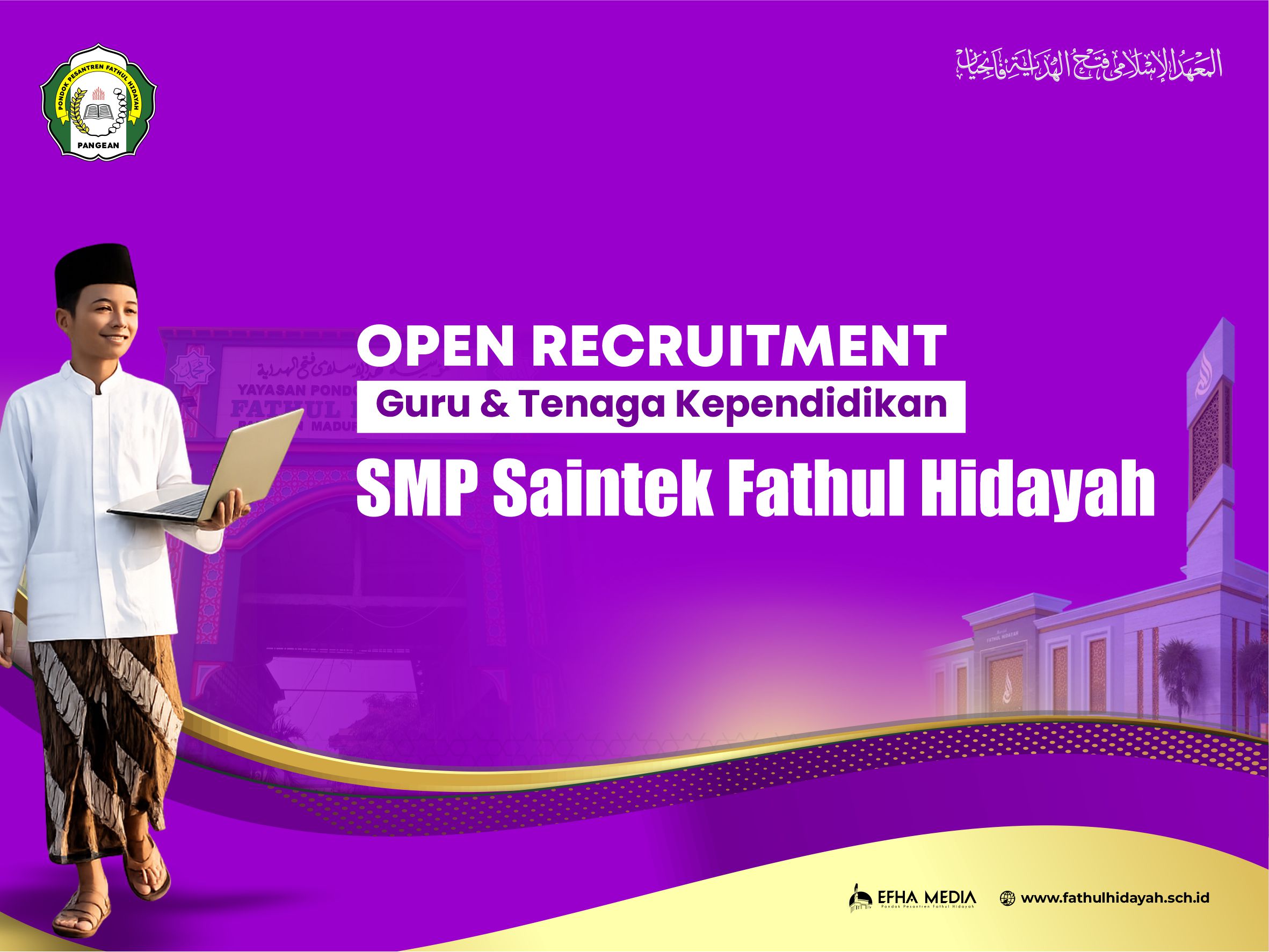 SMP Saintek Fathul Hidayah membuka kesempatan bagi para pendidik dan tenaga kependidikan terbaik untuk bergabung dan tumbuh bersama kami. Sebagai bagian dari Yayasan Pondok Pesantren Fathul Hidayah, kami berkomitmen menghadirkan pendidikan yang memadukan nilai-nilai keislaman, sains, dan teknologi dalam lingkungan yang profesional, amanah, dan visioner.
